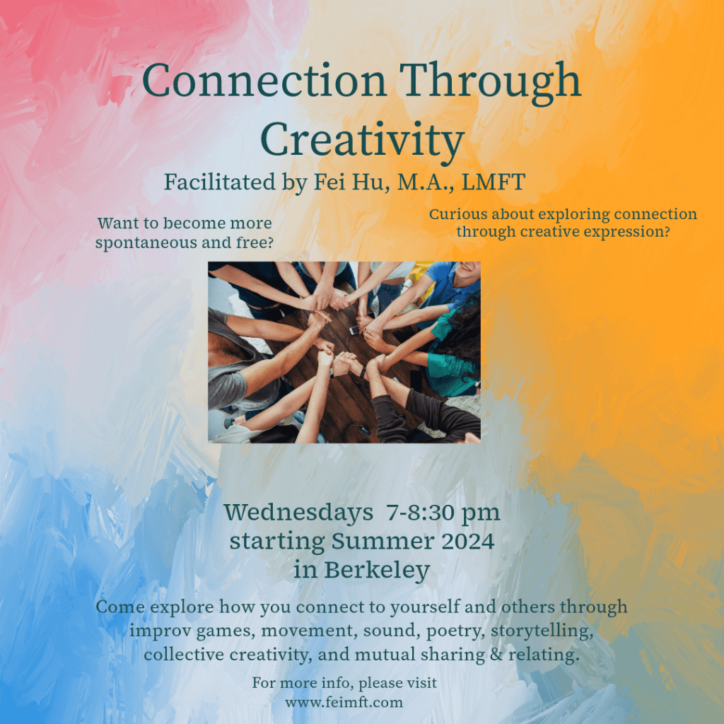 Next Connection Through Creativity Groups will take place on August 14th and 21st, 2024 at The Psychotherapy Institute in Berkeley (2232 Carleton Street). Cost is $30 per session. Please RSVP at fei.mft@gmail.com.