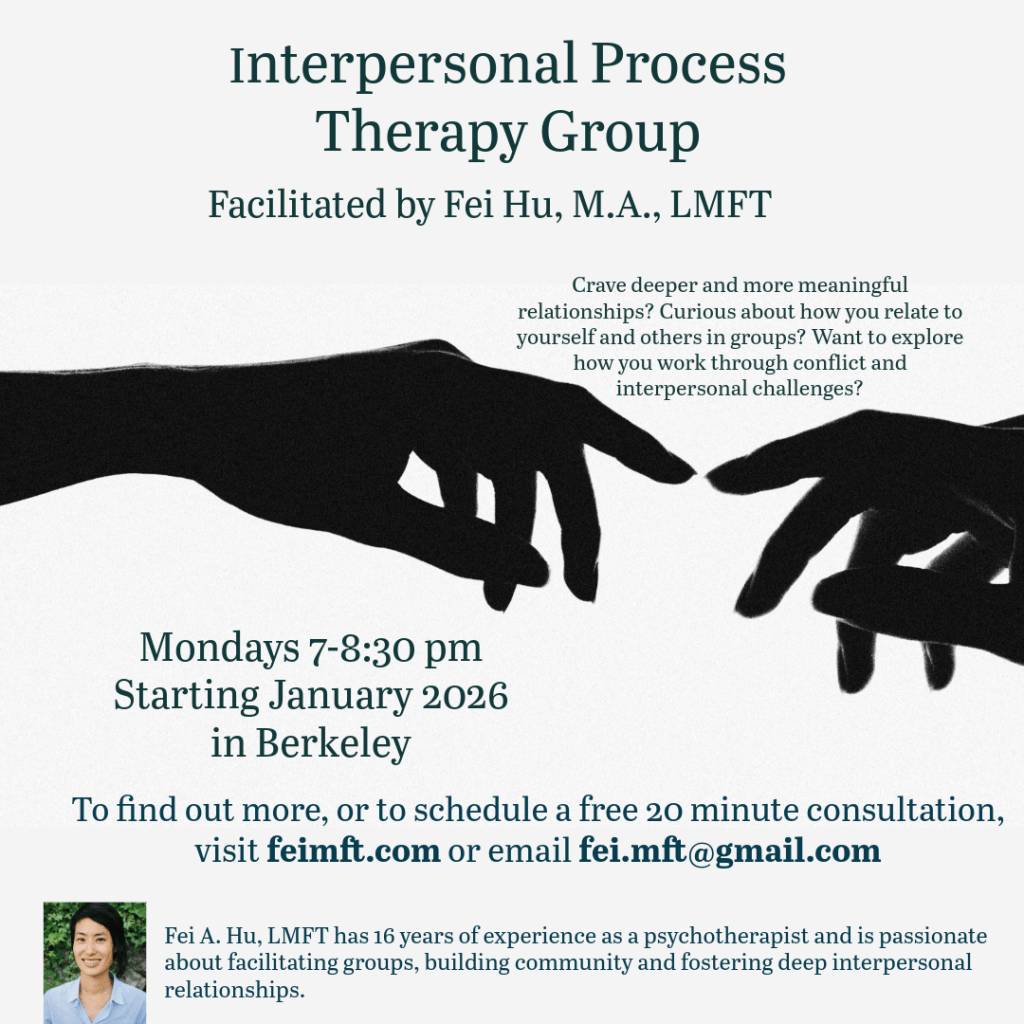 To see if you might be a good fit for this group, please contact Fei at fei.mft@gmail.com.